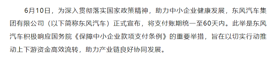 东风汽车表示,为深入贯彻落实国家政策精神,助力中小企业健康发展,东风汽车将支付账期统一至60天内。